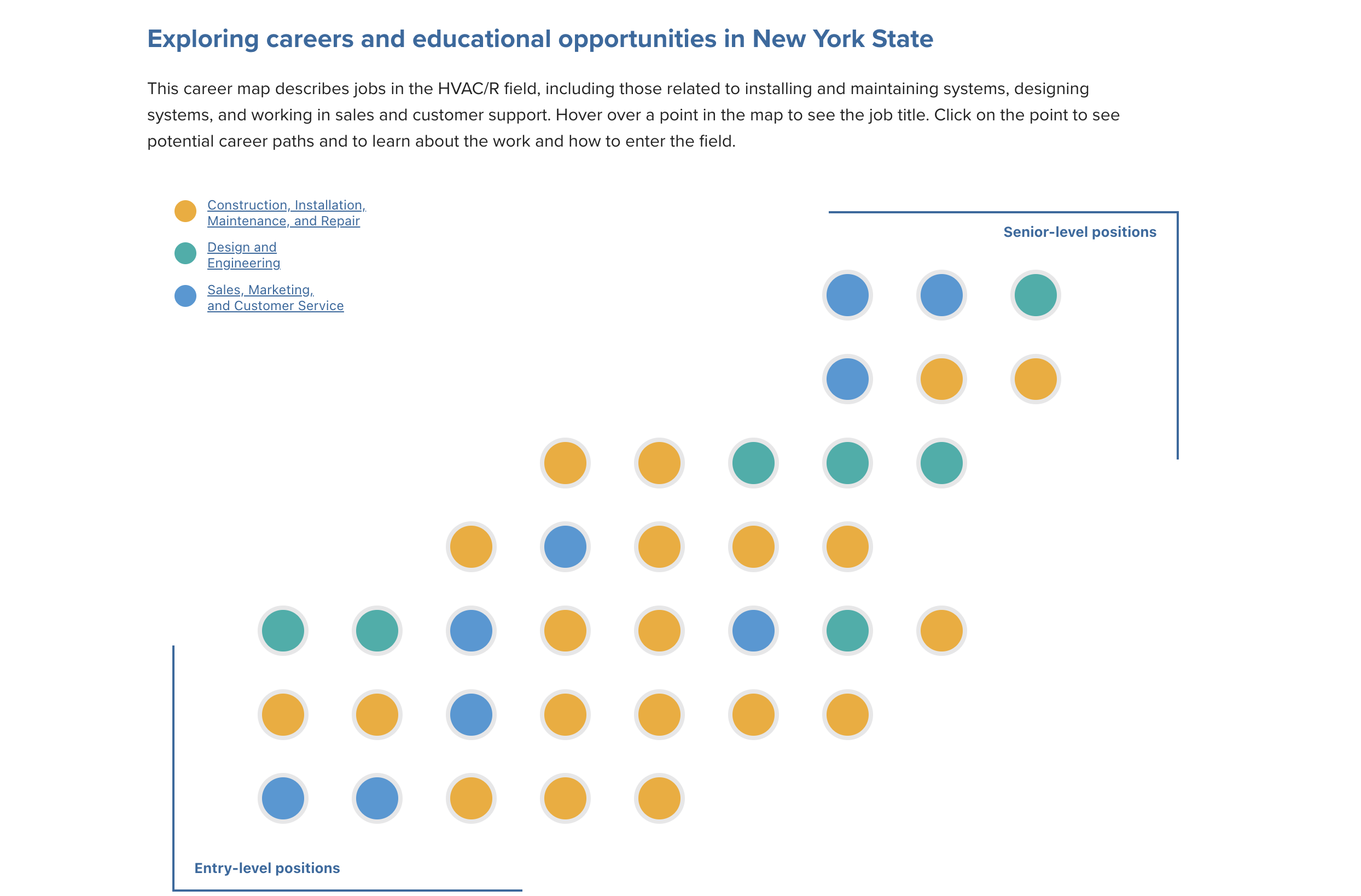The NYSERDA NY State Career Opportunities in HVAC/R (Heating, Ventilation, Air Conditioning, and Refrigeration) website and career map have been updated with new data on wages, employment projections, insights into who’s hiring, and education programs for New York State jobs in the HVAC/R field. Whether you’re interested in workforce development programs, partnerships, and educational opportunities; designing economic policy; or are exploring a career for yourself in this field, this research can support your goals.
